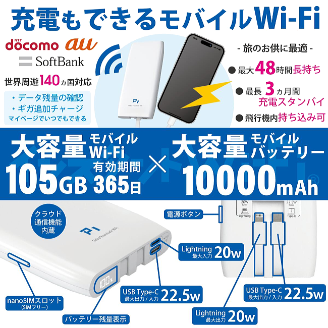 ● クラウドSIM (SIMフリー端末)内蔵 ● 同時接続:最大8台 ● バッテリー:10,000mAh ● 連続通信時間:48時間
